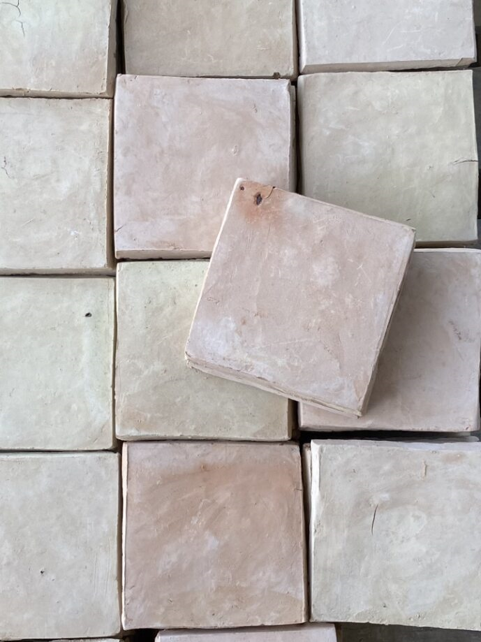 The dried tile blanks are then hand formed into tiles using a traditional wooden mallet (which is also made by hand from local wood) to pound and compress the clay, removing air pockets. During this process the clay surface is smoothed by hand using a spatula, which gives Zellige tiles their characteristic undulation.The tile blank is then cut to square or rectangular shapes using a metal guide to ensure the tiles are all cut to the same size. The clay remnants from the cutting are recycled back into the raw clay for future use.