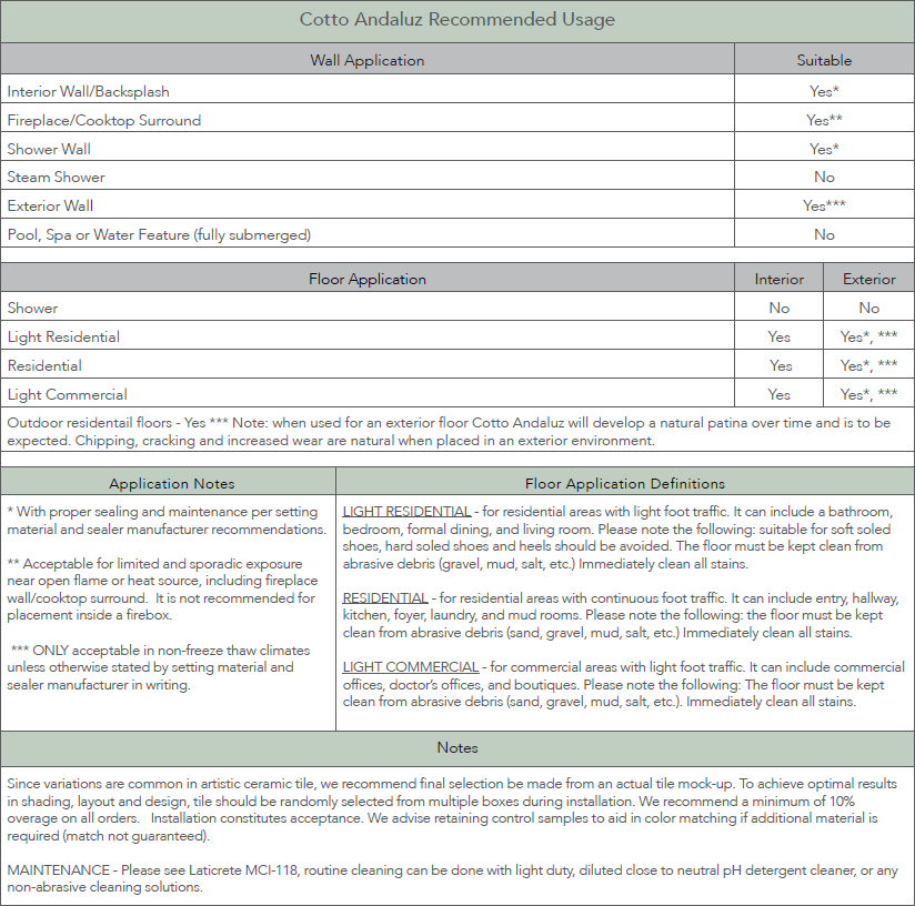 Cotto Andaluz terracotta tiles are made entirely by hand and antiqued to create a unique patina. Each tile will be different from the next. Please expect the following characteristics which are inherent and intended characteristics in authentic handmade tiles.
