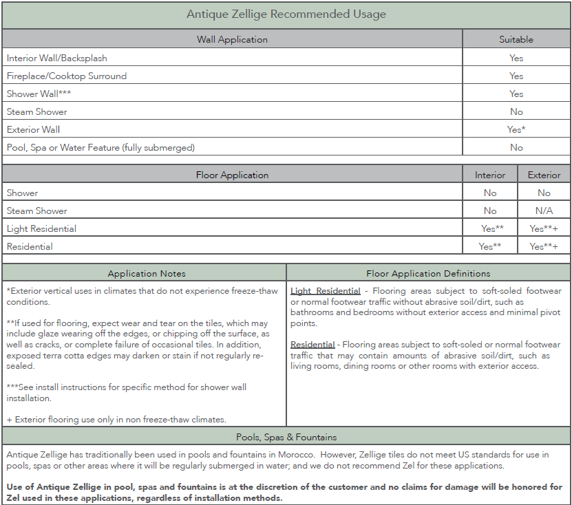 Antique Zellige tiles are made entirely by hand in Morocco and each tile will be different from the next. Tiles are treated to create an aged patina, please expect the following characteristics which are intended in this product.