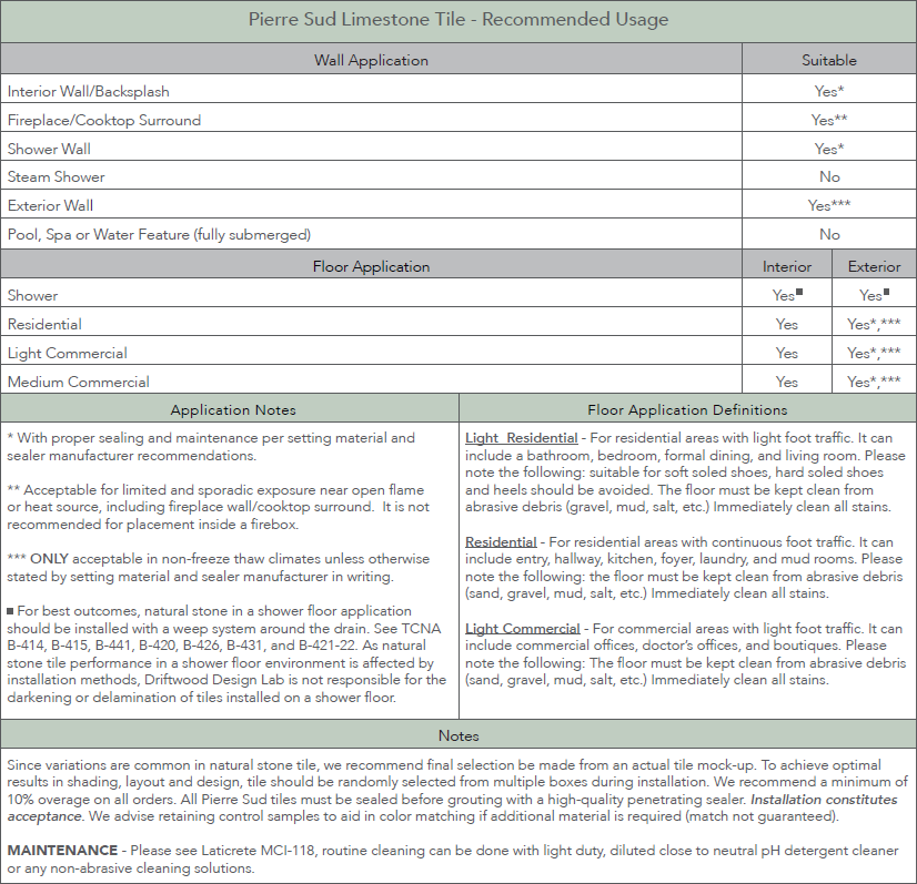 Pierre Sud Natural Stone tiles are products of nature and no two tiles will look exactly alike. Please expect the following characteristics, which are intended and part of the product’s appeal.